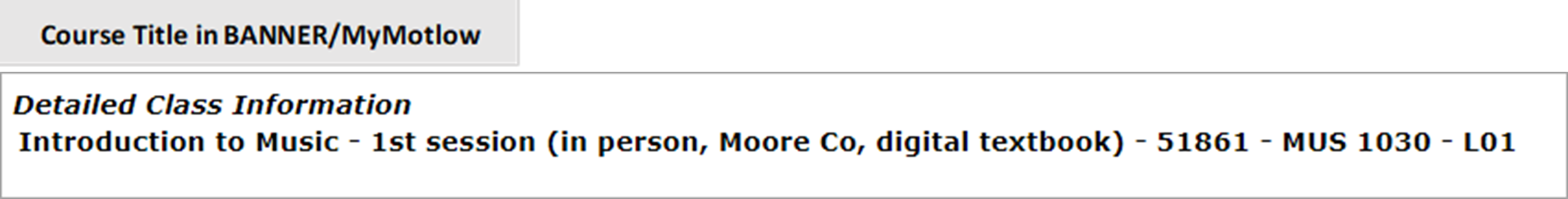 First, and perhaps the most noticeable, is the change to the course title. The course title will now match what is listed in BANNER/MyMotlow. In D2L, you will now see that the title contains information about the modality of the course (i.e., “in person” or “online”) and whether or not a textbook is required. This course title is exactly what is presented to students when they register for the course in MyMotlow.